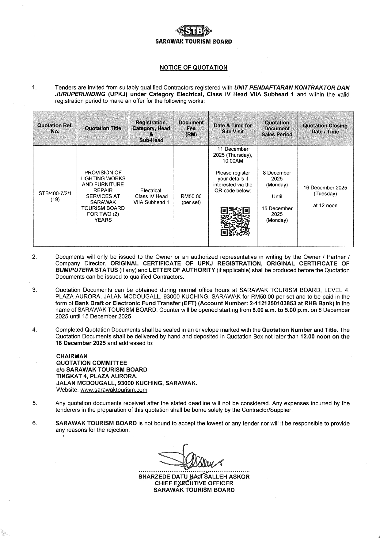 2. NOTICE OF QUOTATION : PROVISION OF LIGHTING WORKS AND FURNITURE REPAIR SERVICES AT SARAWAK TOURISM BOARD FOR TWO (2) YEARS.